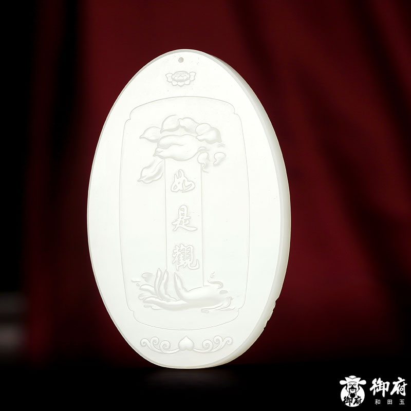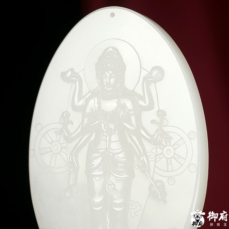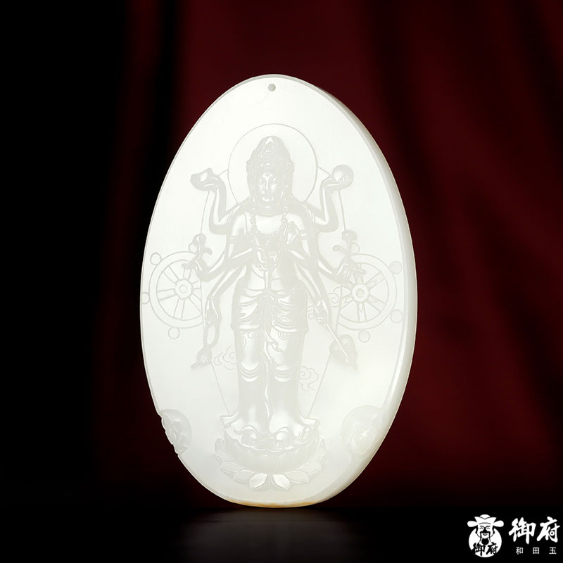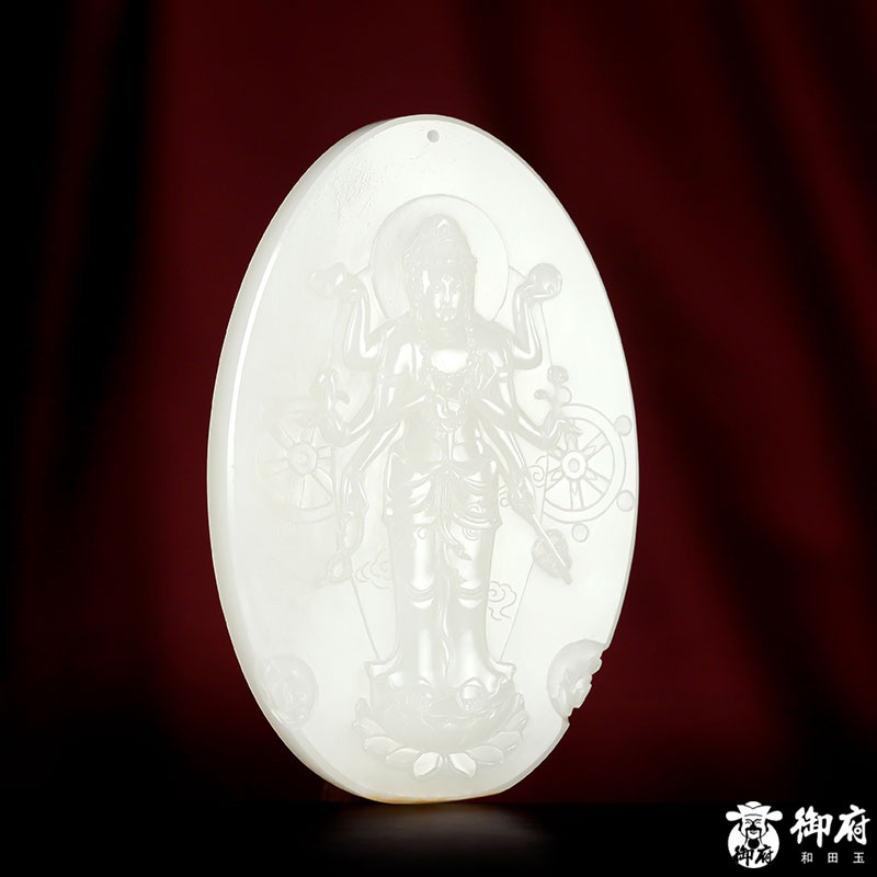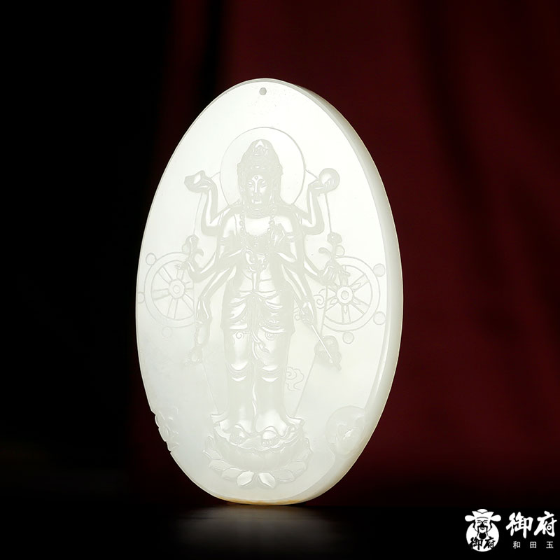 《千手观音》为新疆和田玉羊脂白玉籽玉玉牌,玉质温润细腻,质地致密,羊脂白色,丰盈油润。珍贵稀有,乃玉中佳品。