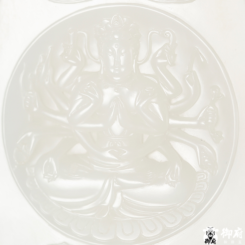 付雪飞大师在玉面上精心雕刻千手观音,观音手持多件法器,端坐在莲花宝座上,双目微闭,面容慈祥端庄,显得静穆幽谧。