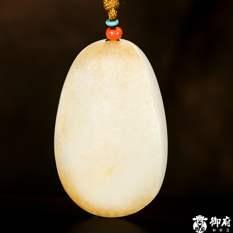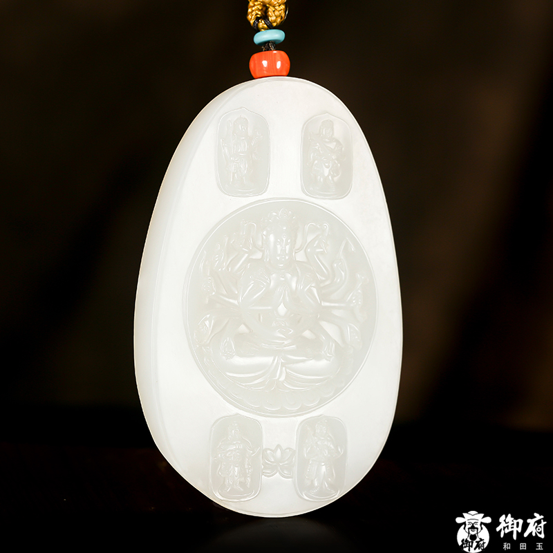 新疆和田玉洒金皮白玉籽玉玉牌《千手观音》,选用质地细密滋润、色润白、柔和莹亮的上等白玉籽玉。玉面上覆盖着靓丽的洒金皮色。