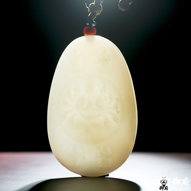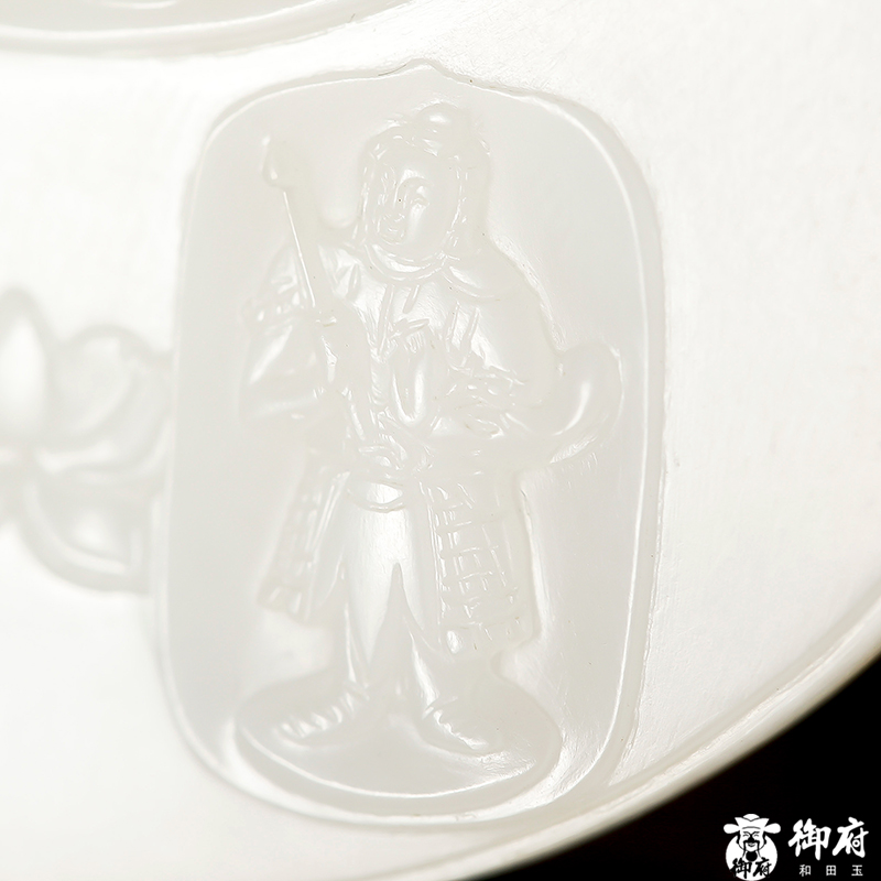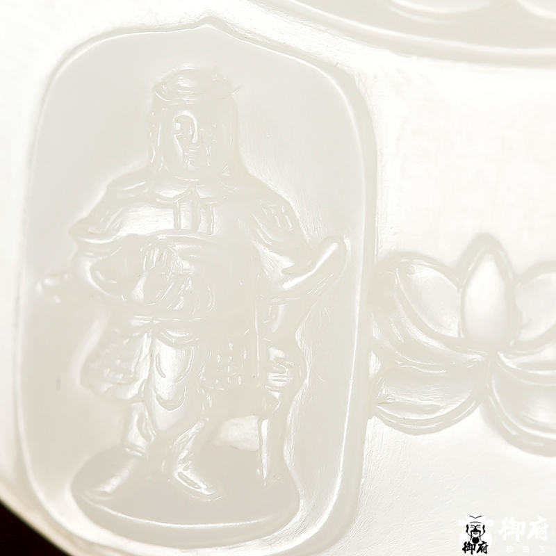 玉牌底端雕刻莲花,四周雕四大护法金刚,其形象肃穆威严,整体布局协调,细节精致。