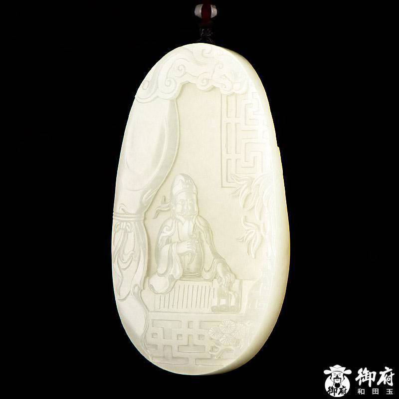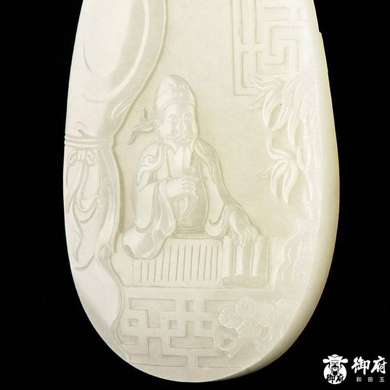 玉牌正面雕苏轼端坐玉青帐下,面前案上摆放着书卷,但却手捋着胡须,面含微笑看着窗外的竹子。