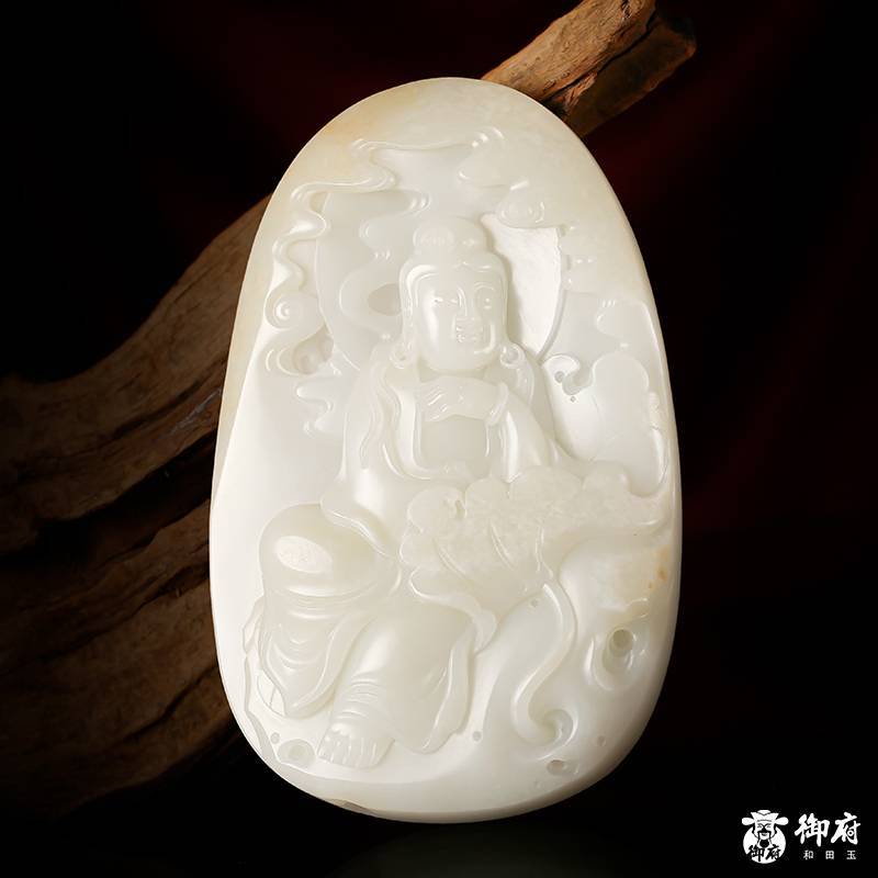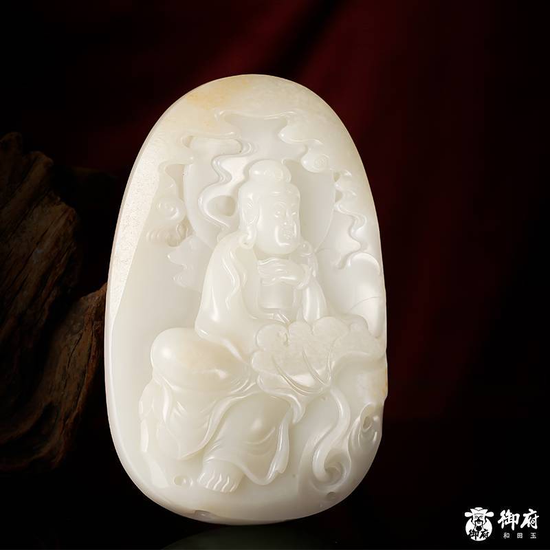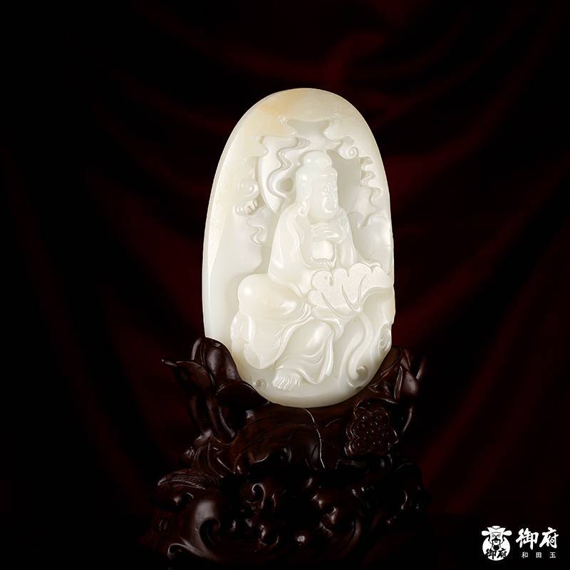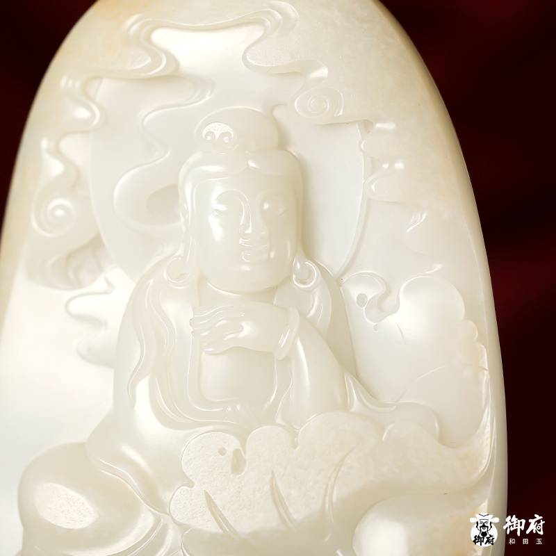 《观音》为新疆和田玉摆件作品,玉石外形圆润,玉质紧密白洁,细腻温润,荧光外耀,精光内蕴。玉面有靓丽皮色,灿烂绚丽。