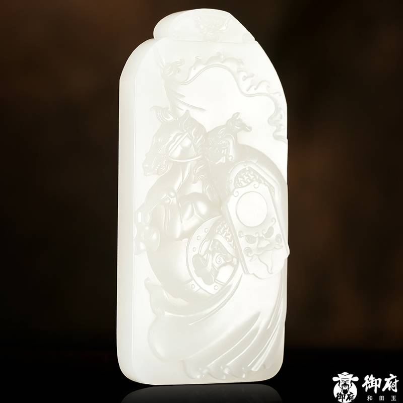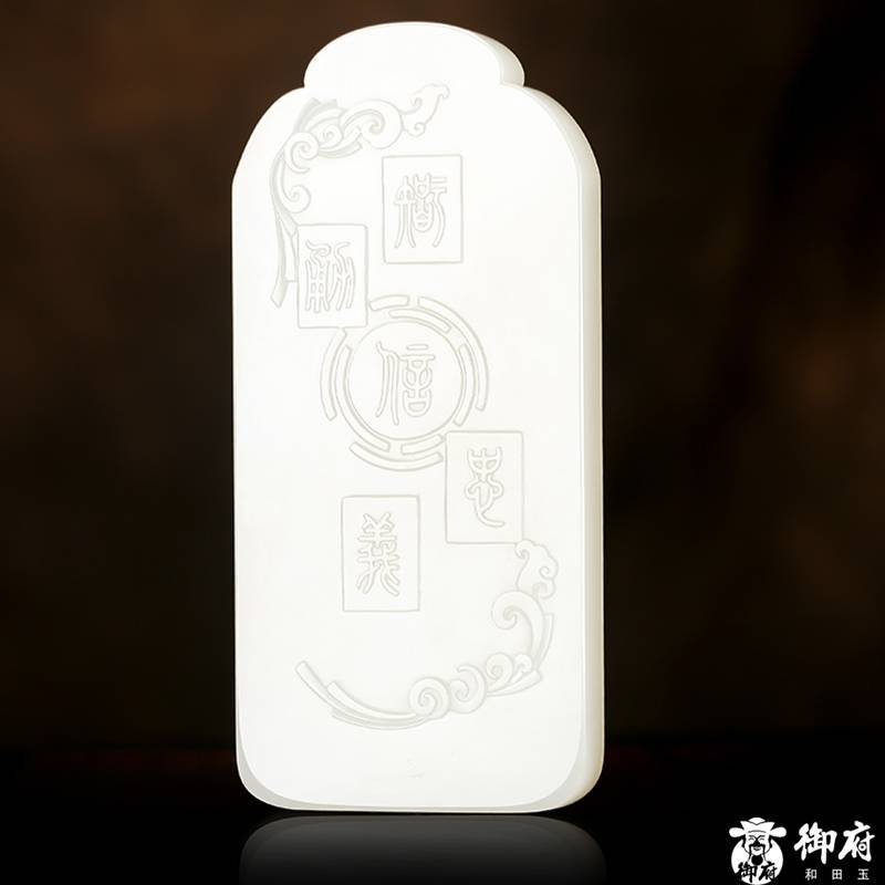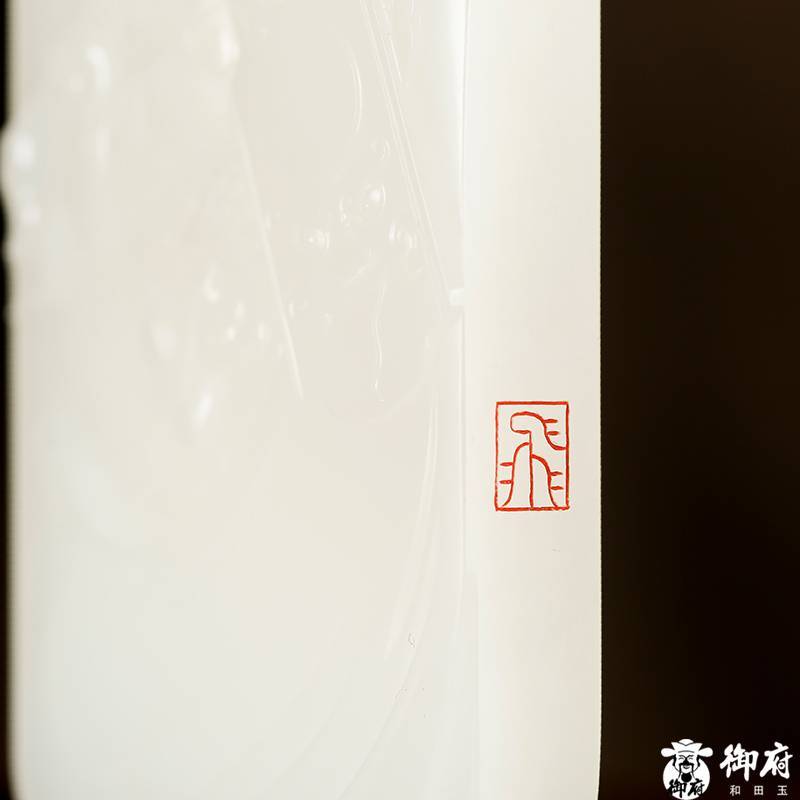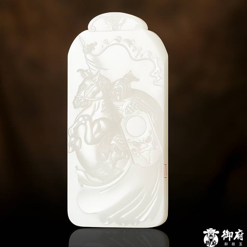 新疆和田玉白玉籽玉作品《精忠报国》,牌型规整,油润顺滑,色泽莹亮,白度极佳,质地温婉柔和,展现了和田玉的顶级品质。