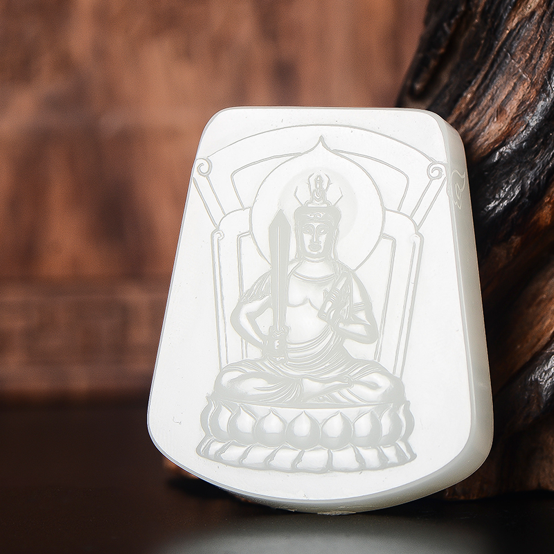 新疆和田玉玉牌籽玉作品,玉牌轮廓规整,美观大气,玉质纯净,细腻温润,油脂光泽,油性佳,手感舒适,富贵娇美。玉牌正面雕刻虚空藏手持法器,端坐在莲花座之上,虚空藏密号库藏金刚,是中国大乘佛教八大菩萨摩诃萨之一。虚空藏菩萨摩诃萨在无量菩萨中专主智慧、功德和财富。因尊上智慧、功德、财富如虚空一样广阔无边,并能满足世间一切如法持戒者的善求善愿,使无量无边众生获得无穷利益,故有此虚空藏圣名。玉牌玉雕刀法精湛,风格古朴,工艺精巧,题材新颖,融入源远流长的佛学文化,实为佛家之宝,缘者之福。