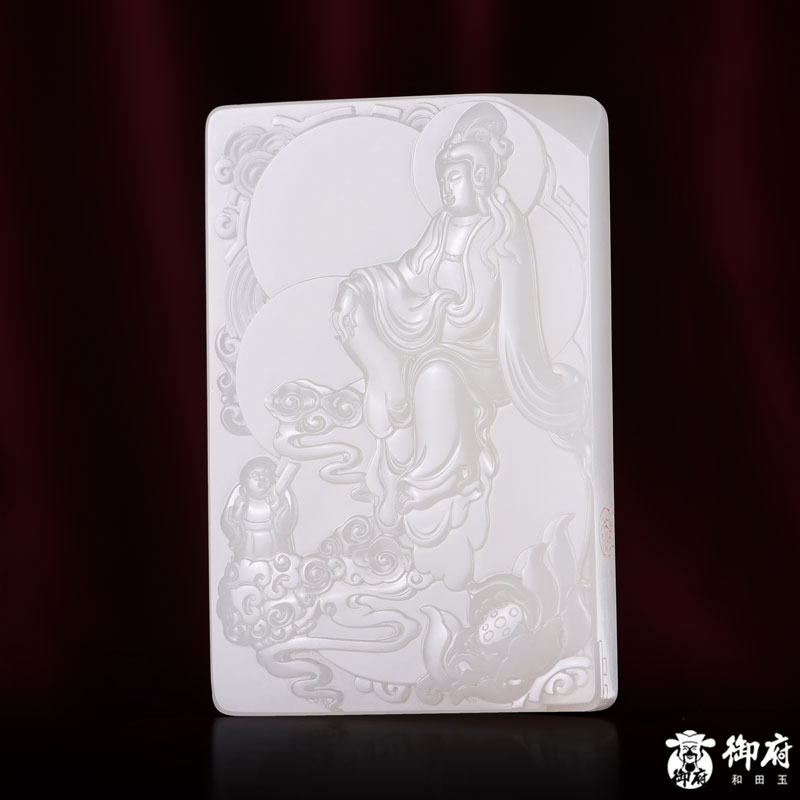 付雪飞工作室 重100克 新疆和田玉羊脂白玉原毛孔皮玉牌 财神聚宝图
