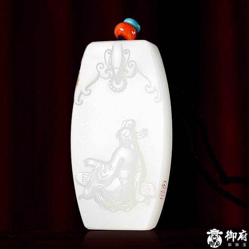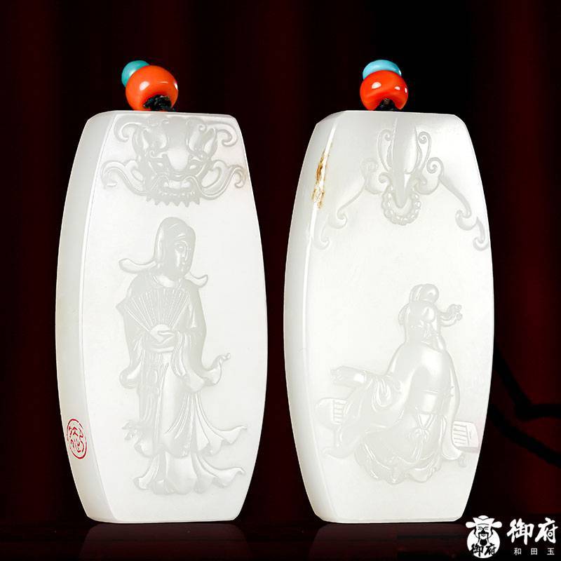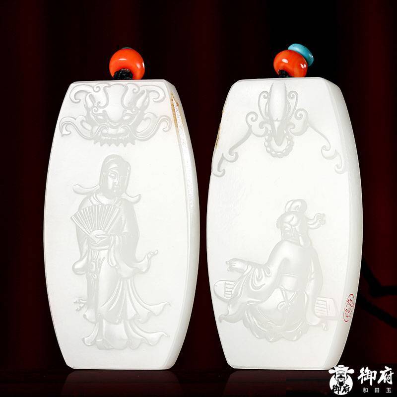 另一玉牌浮雕多情公子,手执纸扇,玉树临风,气宇轩昂。牌头雕龙凤相配。