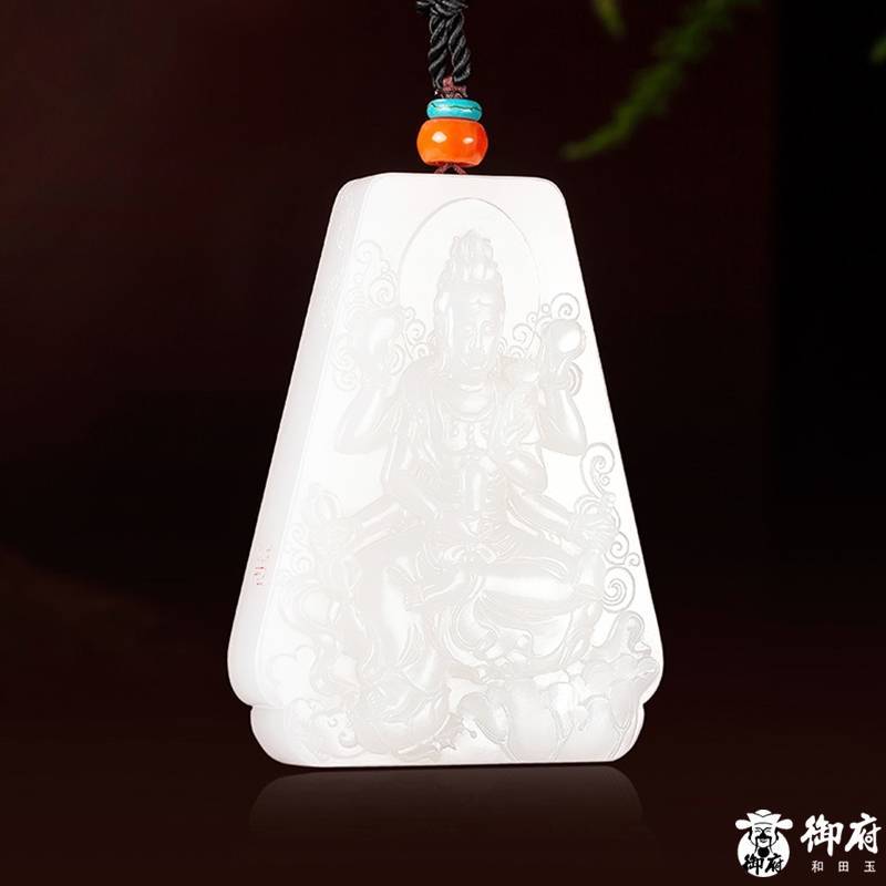 作品《千手观音》为新疆和田玉白玉籽玉作品,玉石皮色分布在玉石一侧,色白皙光泽莹亮,温润饱满,精光内蕴。
